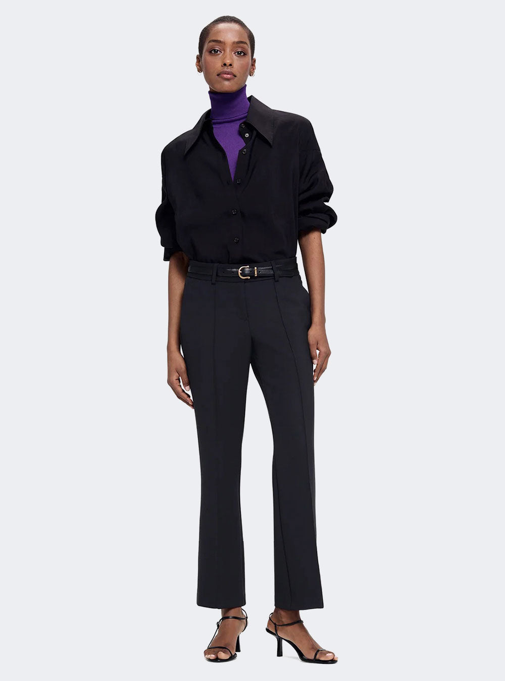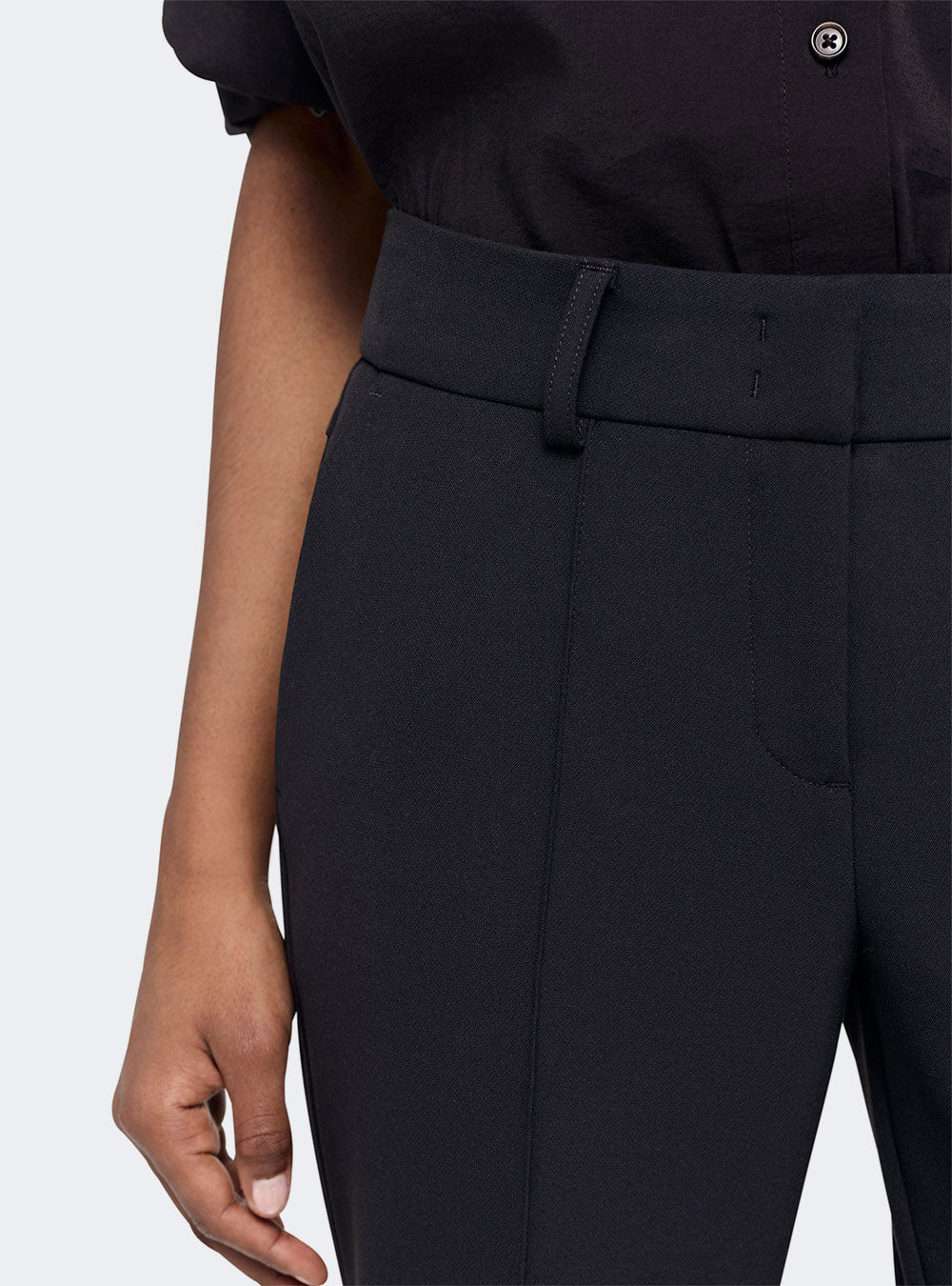 Farah cropped flared trousers. The trousers in a high-quality wool substitute double provide the perfect basis for an elegant, classy look. Available in sterling, black, cherry burgundy and dark navy.