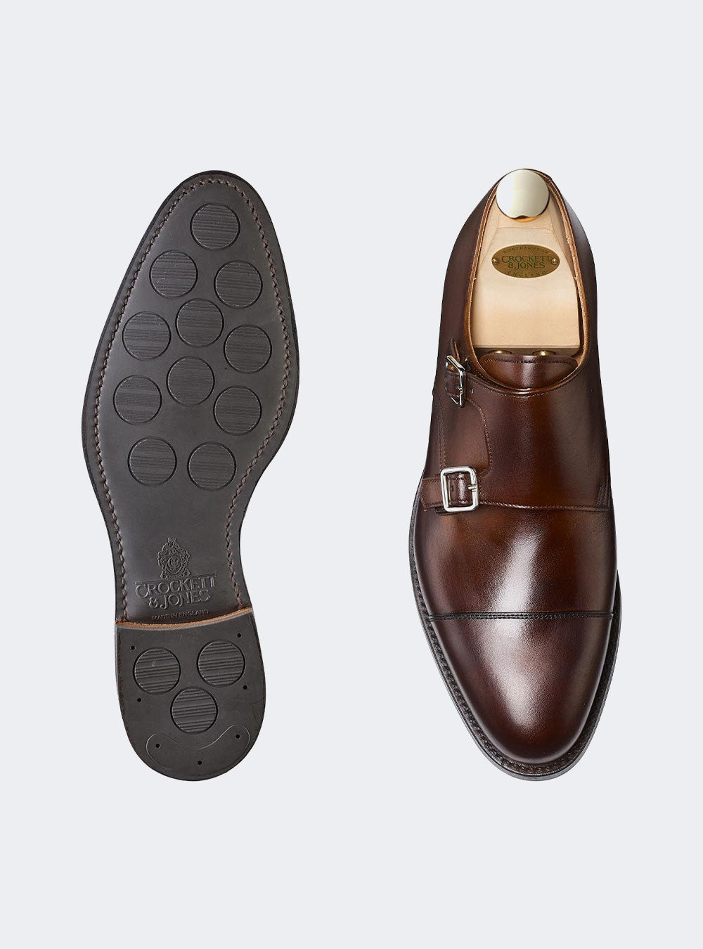 Crockett & Jones Lowndes 4, a double buckle monk shoe with a straight toe cap, is made on the new last 379. Made from the finest dark brown burnished calf leather with their 'City' rubber sole.