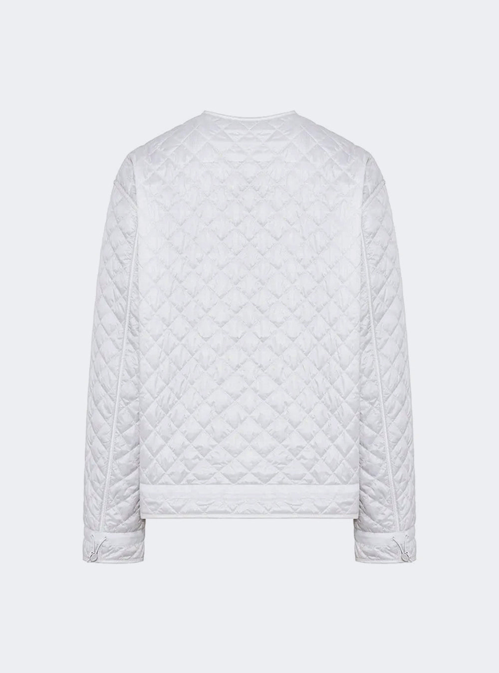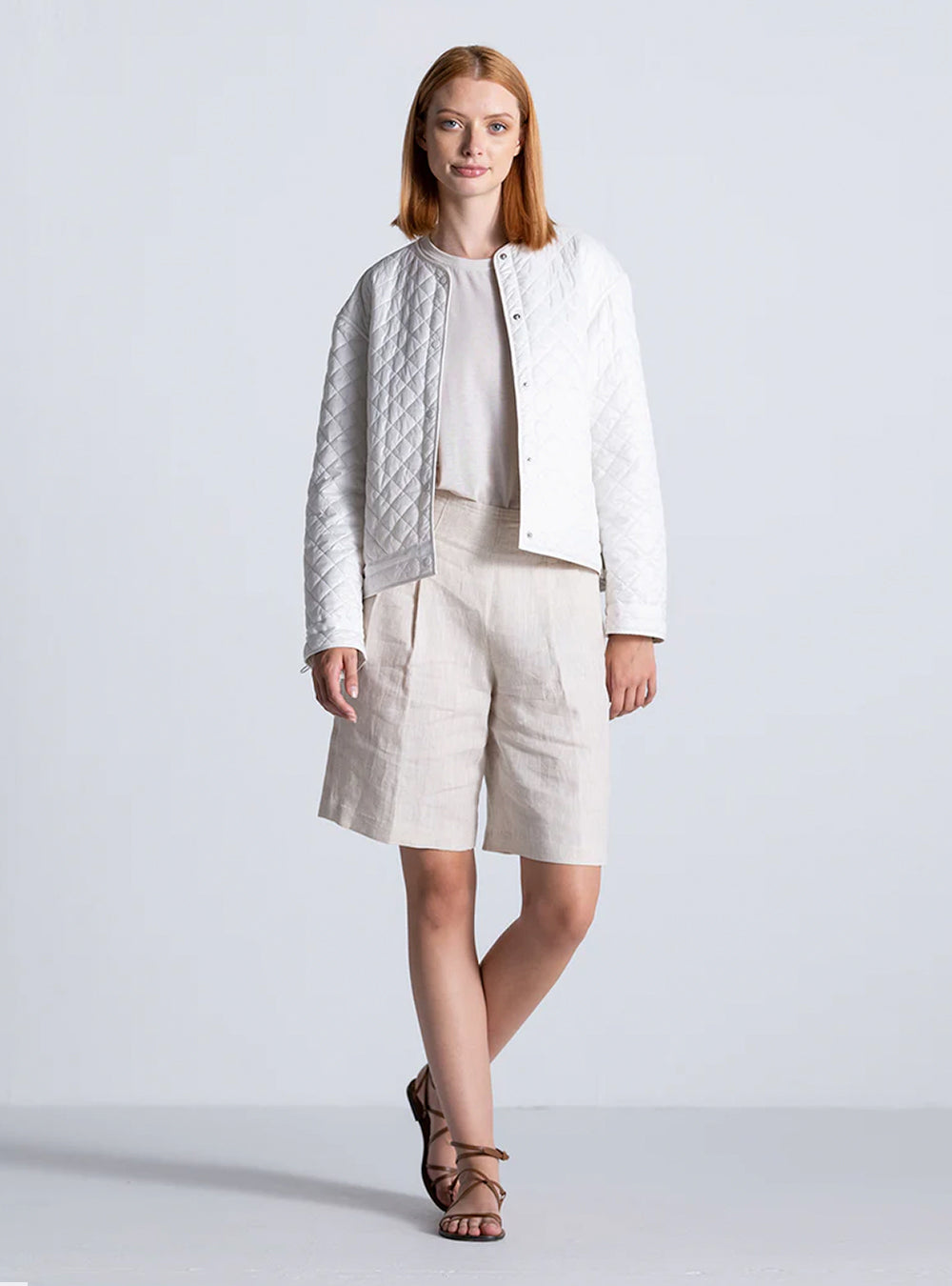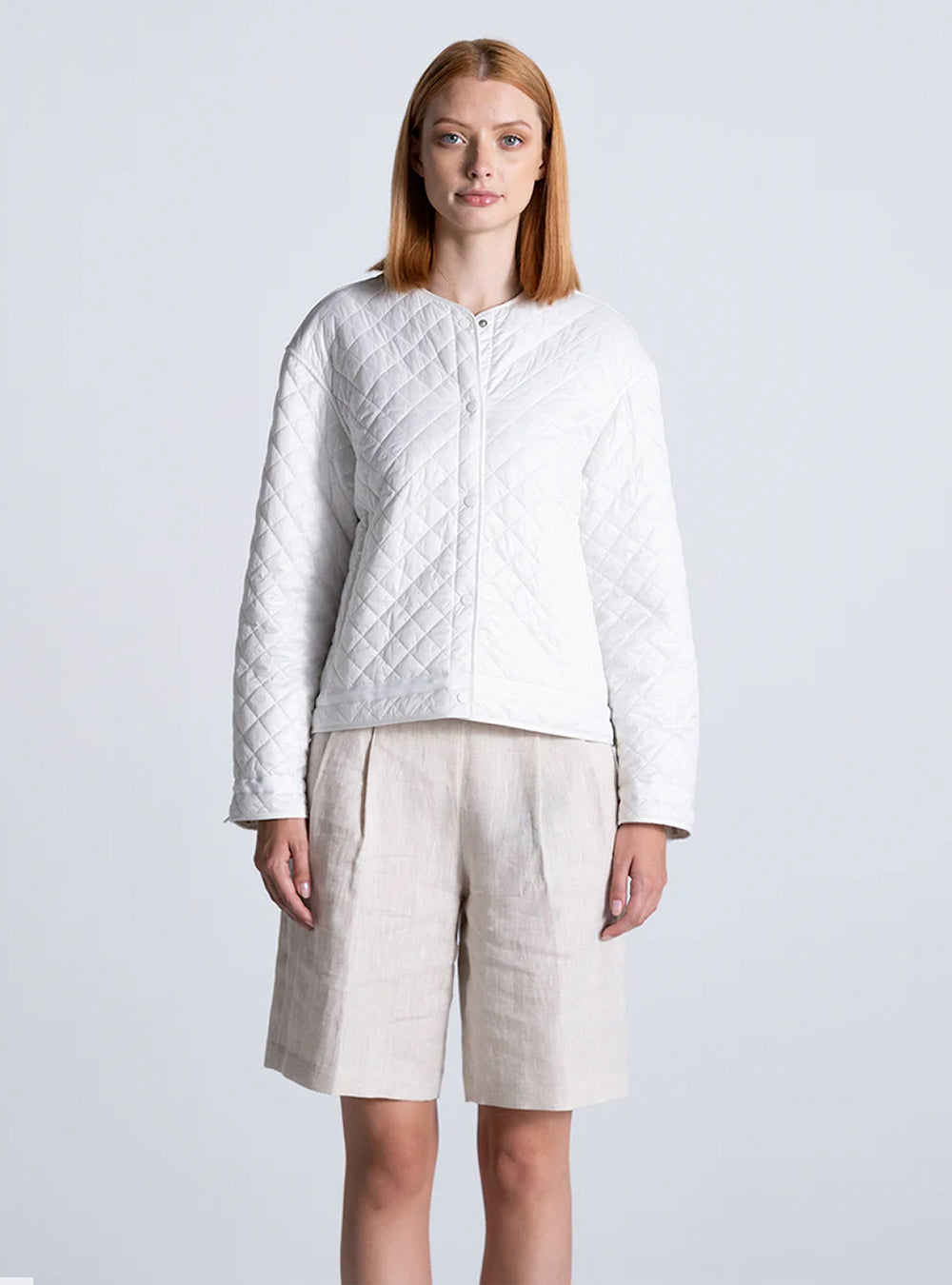 Duno reversible short jacket without collar, flared line and snap closure. Ribbon detail at the hem and cuffs in which a hidden drawstring makes the width adjustable. On the outside, a quilt with micro-geometric design of ultra-lightweight technical fabric and side pockets with zip closure; on the inside, the same fabric is in a smooth version.
